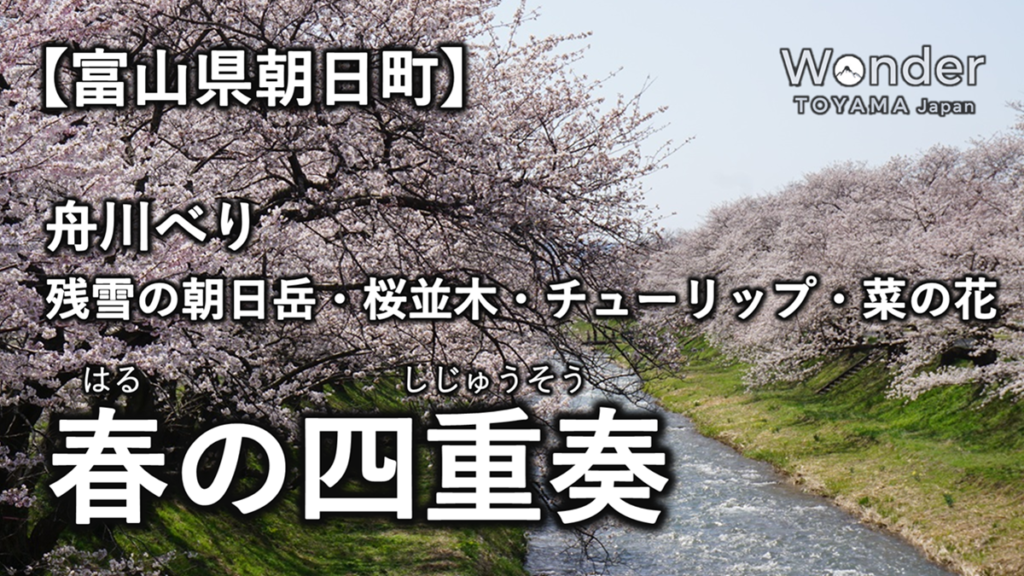 【春の四重奏】残雪の朝日岳を背景に春らんまんの絶景|富山県朝日町舟川べり