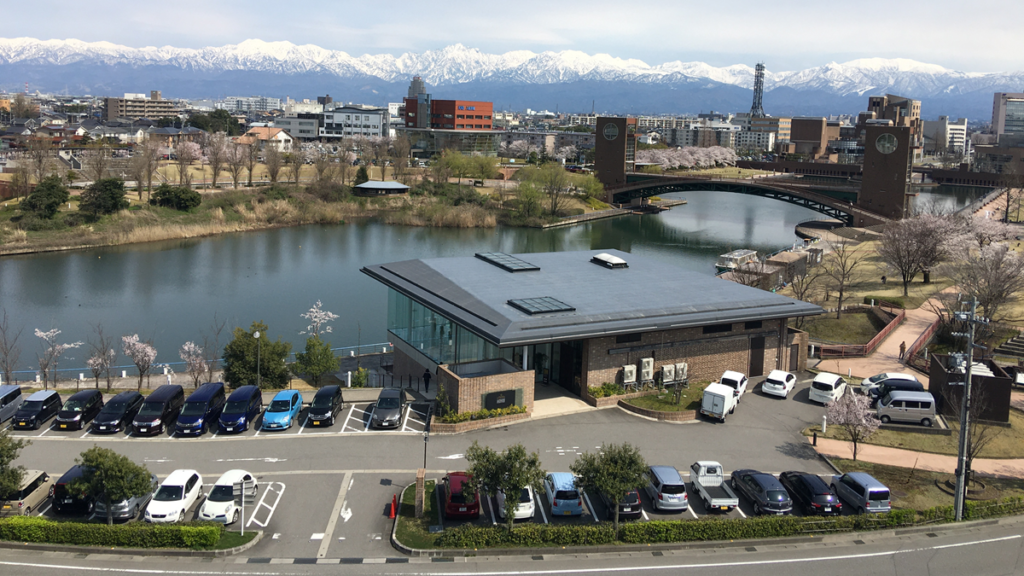 この時期は、立山連峰にまだ雪が残っており、富山県美術館の屋上「オノマトペ」から望む環水公園の景色は、ぜひ一度は体験してほしいおすすめの眺望です。