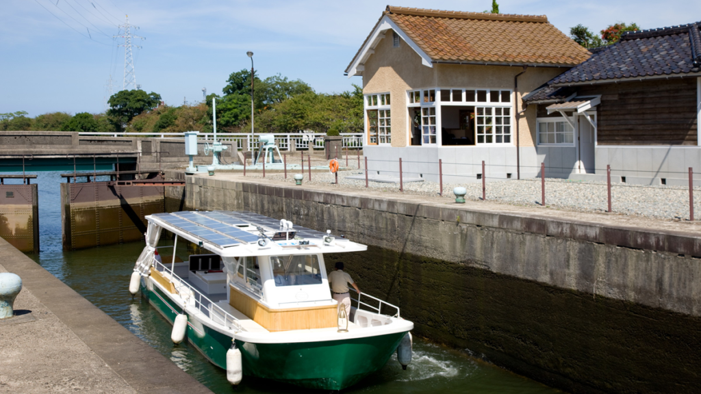 中島閘門は、パナマ運河の水門と同じ仕組みを持ち、運河の上流と下流の水位差を調整する「水のエレベーター」とも呼ばれています。