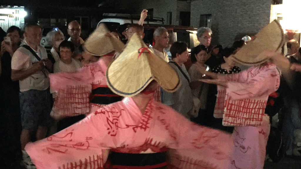 踊り手たちは編笠を深くかぶり、顔を見せないまま、しなやかで品のある所作を見せます。